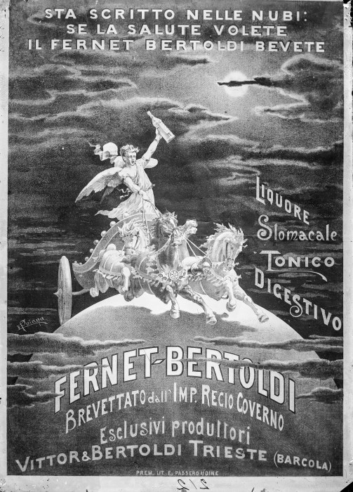 Riproduzione fotografica di un manifesto pubblicitario della bevanda "Fernet - Bertoldi" di Trieste; nell'immagine, oltre alle iscrizioni pubblicitarie, il disegno di un uomo su di una biga trainata da cavalli mentre alza al cielo un bottiglia.