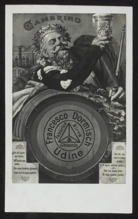 Reclame della fabbrica di birra e ghiaccio Dormisch di Udine. Il capostipite e fondatore di origine austriaca, Francesco Dormisch, nel 1881 aveva avviato un piccolo stabilimento di birra a Resiutta, dove abitava, sulle rive del torrente Resia ed una decina di anni dopo apre la fabbrica di Udine a porta Villalta, sfruttando l'energia del canale Ledra.