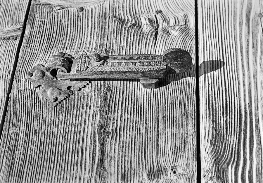 Riproduzione fotografica della maniglia decorata e in ferro battuto di una porta in legno.