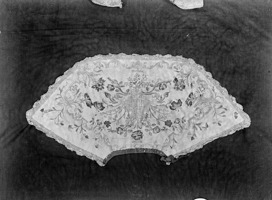 Riproduzione fotografica di un mantello con ricami di foglie e fiori, posizionato su fondale in tela scura per la documentazione fotografica.