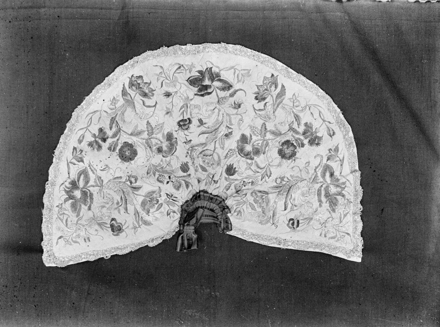 Riproduzione fotografica di un mantello con ricami di foglie e fiori, posizionato su fondale in tela scura per la documentazione fotografica.
