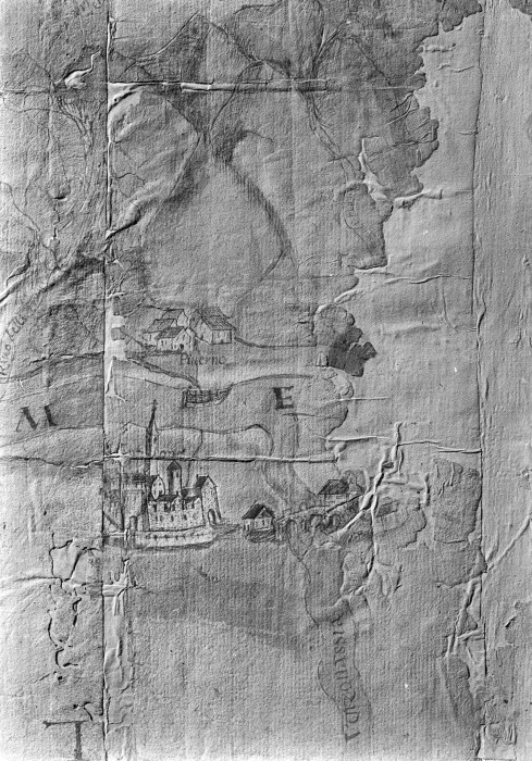 Riproduzione fotografica di una mappa raffigurante la zona di Venzone e Pioverno con i disegni delle abitazioni, dei ponti e dei fiumi.