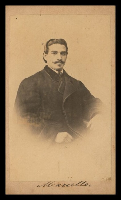 Ritratto in studio di giovane uomo coi baffi, con un indosso cappotto pesante