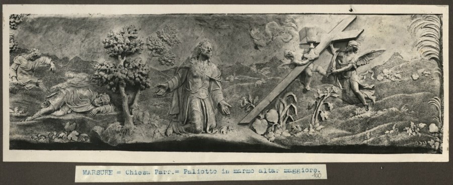 Riproduzione fotografica del paliotto in marmo dell'altare maggiore della Chiesa di San Lorenzo Martire a Marsure di Aviano: raffigura il momento in cui Gesù mentre prega nel podere chiamato Getsemani sul Monte degli Ulivi, riceve forza da un angelo che gli mostra la Croce e un calice (a destra) prima del tradimento di Giuda ed altri discepoli addormentati durante la preghiera ( a sinistra).
