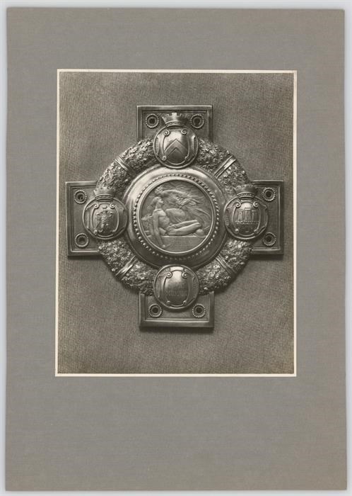 Riproduzione fotografica della medaglia in oro fatta fissare sulla bara del Milite Ignoto nella basilica di Aquileia il 28 ottobre 1921 prima che fosse trasportata a Roma, dove, il 4 novembre 1921, fu collocata nell'Altare della Patria. La medaglia venne coniata dalle città di Udine, Gorizia e Aquileia i cui stemmi sono raffigurati nella cornice a corona di foglie di quercia che contorna la medaglia. L'opera fu realizzata dallo scultore Aurelio Mistruzzi, che la firma in basso a destra con lettere capitali a rilievo, e rappresenta la Gloria alata che si china a baciare sulla fronte il soldato morto, che giace nudo tra oggetti di guerra (elmetto, obici ecc.) reggendo nella destra un pugnale infranto.