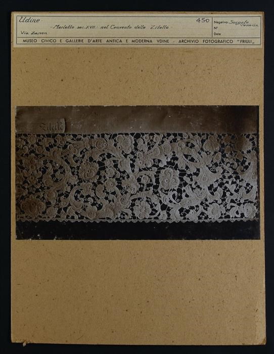 Udine, chiesa della Presentazione di Maria al Tempio: pizzo antico arricchito con decorazioni floreali e vegetali, presumibilmente per tovaglia d'altare. In alto a sinistra, un'etichetta con la dicitura "Zitelle".