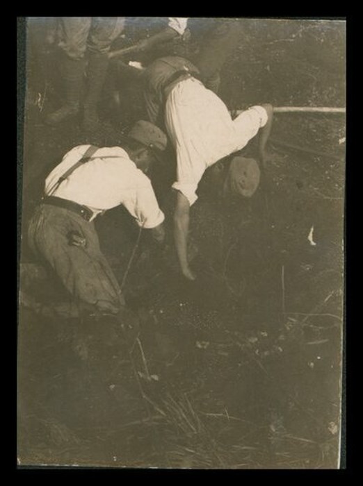 Due militari scavano con le mani in una fossa per recuperare le salme di caduti della Grande Guerra