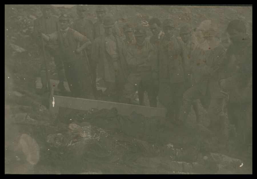 Militari in raccoglimento davanti ad un gruppo di salme di caduti della Prima Guerra mondiale, dopo le operazioni di rinvenimento