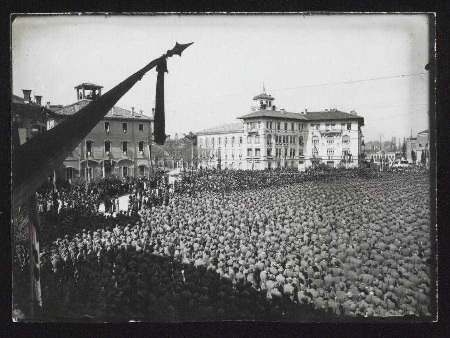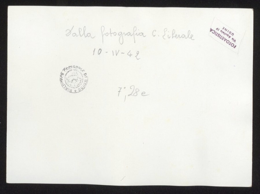 L'immagine riprende parte dello schieramento militare davanti al Tempio Ossario di Udine, il 10 aprile 1942, in occasione della cerimonia in memoria dei quasi mille Alpini del Battaglione "Gemona" caduti nell’affondamento, il 28 marzo 1942, della nave Galilea che doveva riportarli in Patria dopo le vicende sui monti della Grecia. La cerimonia assurse a celebrazione commovente di tutti gli Alpini caduti della "Divisione Julia" e degli altri Battaglioni dell'8° Reggimento.
