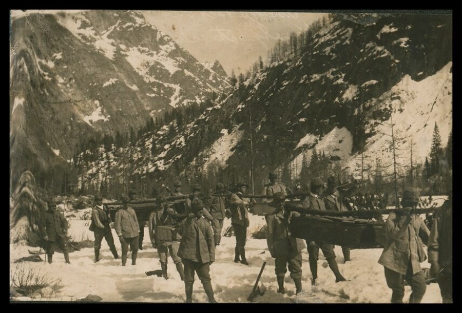 Militari, nella neve, in zona montana, trasportano a spalla delle bare contenenti le salme dei caduti della Prima Guerra mondiale