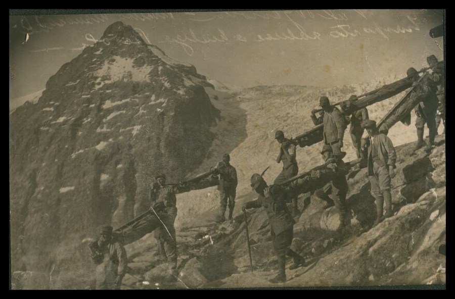 Militari trasportano salme di caduti della Prima Guerra mondiale