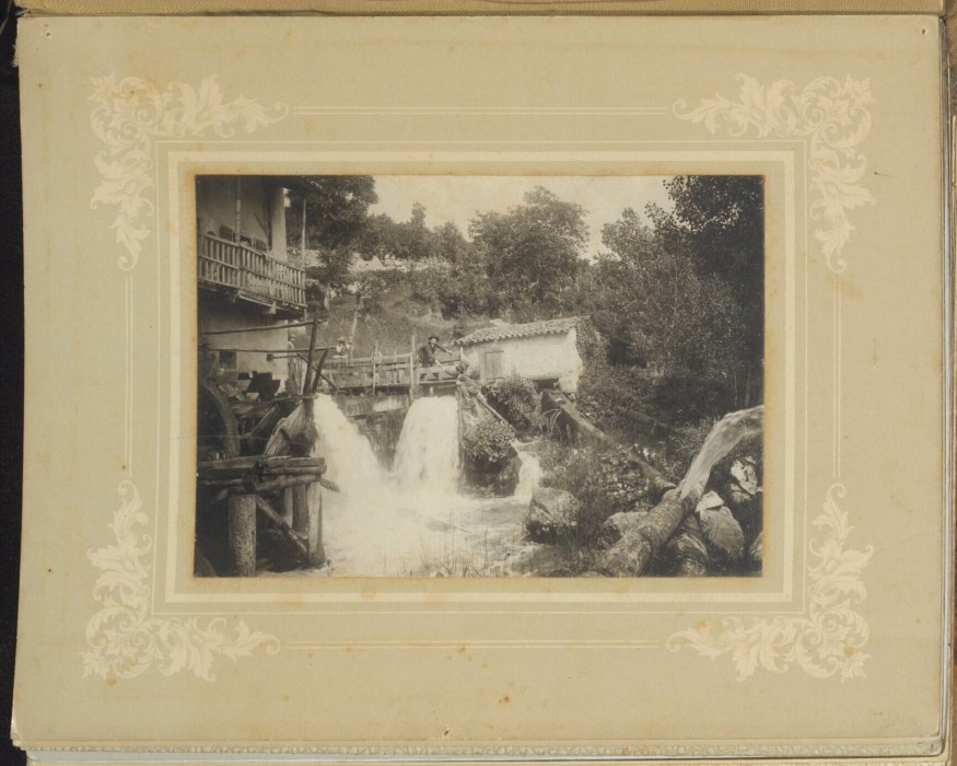 Veduta di un mulino ad acqua presso Venzone: al centro dell'immagine due uomini scavalcano il recinto in legno; sul ponte al lato del mulino dei bambini osservano la situazione. A destra sono visibili delle grosse tubazioni che perdono acqua.