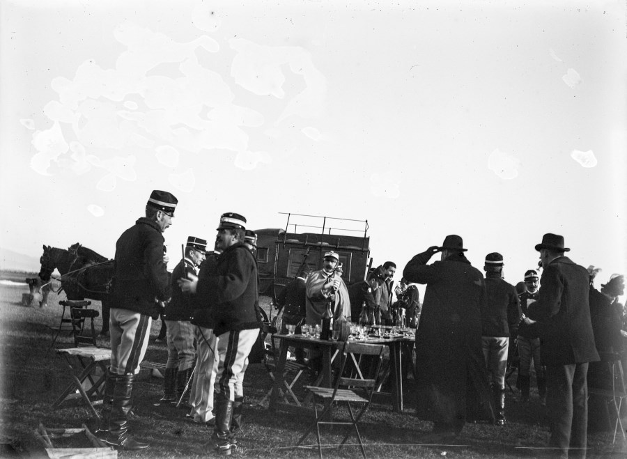 Un gruppo di persone, alcune in divisa altri in borghese tra cui alcune donne, durante un momento convivale in campagna probabilmente durante un convegno ippico; sullo sfondo una carrozza con cavalli.