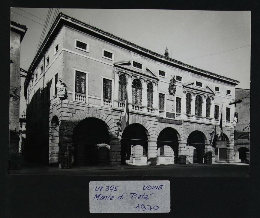 Udine, via Mercatovecchio: veduta della facciata del palazzo cinquecentesco del Monte di Pietà, con portico in bugnato e trifore presenti nel piano nobile, su cui sono stati effettuati degli interventi nella seconda metà del XVII secolo. Agli angoli, delle sculture in marmo che rappresentano la Pietà.