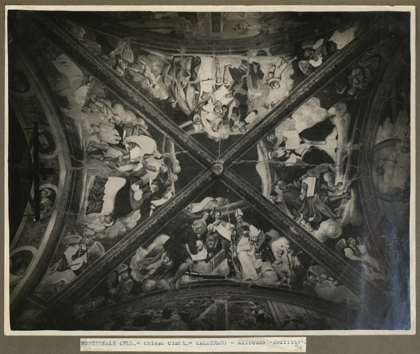 Riproduzione fotografica degli affreschi della volta del coro a opera di Giovanni Maria Zaffoni detto il Calderari, presso la Chiesa di San Rocco a Montereale Valcellina. La piccola chiesa dedicata in un primo momento a Santa Maria Assunta si riflette nei soggetti affrescati. Negli affreschi del Calderari si denotano le influenze del suo maestro Giovanni Antonio de’ Sacchis (il Pordenone) e di Pomponio Amalteo. Nell'immagine a sinistra: una Sibilla non identificabile, il profeta Davide, l’evangelista Giovanni ed il dottore della Chiesa San Girolamo; in alto un'altra Sibilla non identificata, il profeta Mosè, l’evangelista Matteo ed il dottore della Chiesa Sant’Ambrogio; a destra la Sibilla Persica, il profeta Simeone, l’evangelista Luca ed il dottore della Chiesa San Gregorio papa; in basso la Sibilla Libica, il profeta Daniele, l’evangelista Marco ed il dottore della Chiesa Sant’Agostino. Negli angoli delle vele sono dipinti degli angeli musicanti.