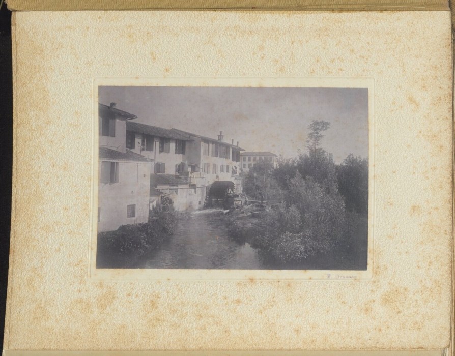 Veduta di mulini ad acqua situati accanto a degli edifici mentre, con il loro movimento meccanico dovuto allo scorrimento dell'acqua del fiume, producono energia meccanica. Un uomo ritratto accanto al mulino più grande.