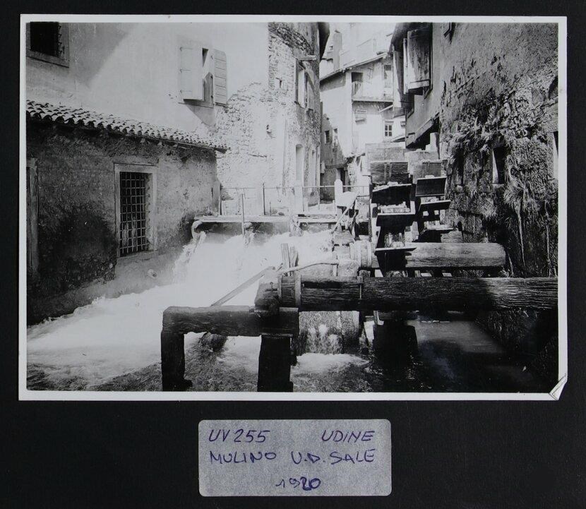 Udine: vicino al Giardino Del Torso, veduta di via del Sale, parallela a via del Gelso, di cui si hanno notizie dalla fine del Trecento. Anticamente, prima del Cinquecento, era definita “del Mulin” poiché lì si trovava il mulino ripreso nello scatto, demolito negli anni Venti del XX secolo. Successivamente la via diventò "Del Sale" per la presenza di depositi salini.