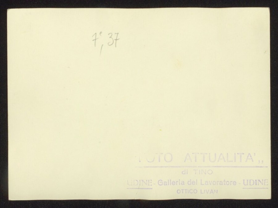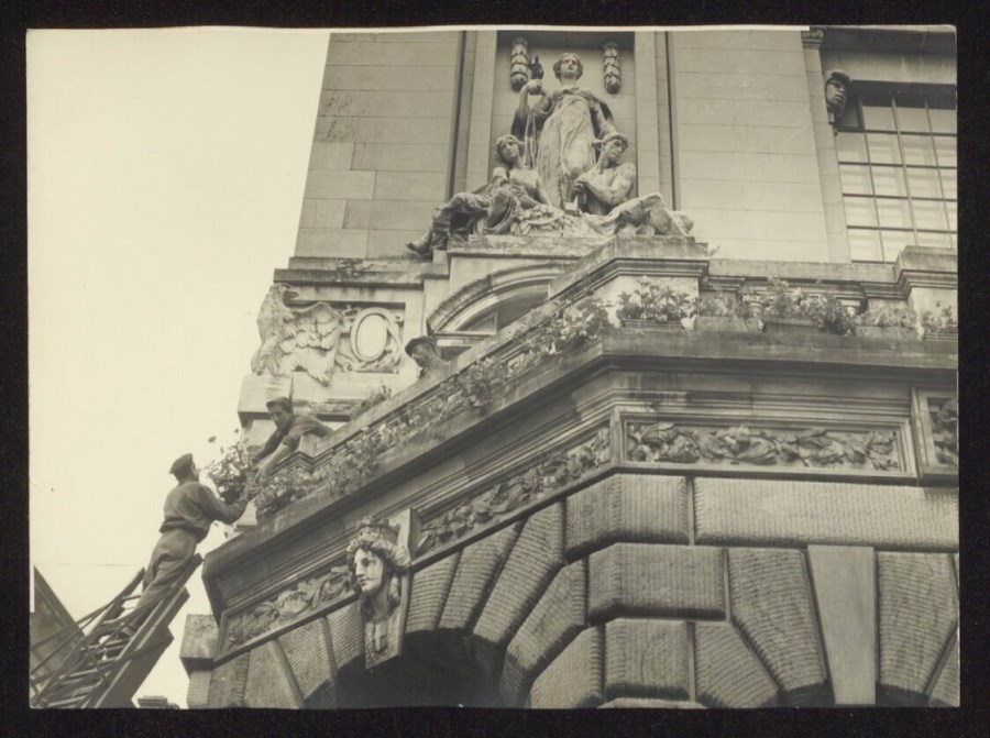 Particolare della facciata di Palazzo D'Aronco, sede del Municipio di Udine, progettato in stile Liberty dall'architetto Raimondo D'Aronco nel 1888, finito di costruire nel 1925, rifinito nei primi anni '30 del Novecento. Nell'immagine sono ritratti tre uomini, uno dei quali su una lunga scala allungabile e due su una delle terrazze del Palazzo, nell'atto di collocare dei vasi di piante, all'apparenza gerani, sulla modanatura sporgente della facciata.