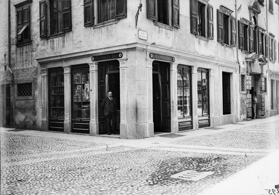 Ritratto di un uomo con abito nero e cappellino sul ciglio della porta del negozio "Lodovico Bon", probabilmente il proprietario, in via Rialto a Udine. Il negozio, che si trovava al n. 5 della via, vendeva prodotti alimentari e l'inserzione pubblicitaria presente nella "Guida delle industrie e del commercio del Friuli pubblicata sotto gli auspicii della Camera di commercio e dell'Associazione fra commercianti ed esercenti della città e provincia di Udine" di Gualtiero Valentinis, del 1910, illustra come la ditta si occupasse di «esportazione prosciutto di S. Daniele preparato in scatole, vini di lusso, conserve alimentari», e come avesse ottenuto recenti onorificenze al "Gran prix e medaglia d'oro all'Esposizione di Parigi del 1909" e alla Mostra Gastronomica di Udine del 1909.