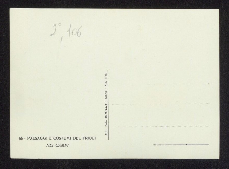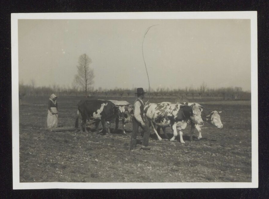 Lo scatto è parte della serie di cartoline pubblicate dal fotografo editore Carlo Pignat con il titolo "Paesaggi e Costumi del Friuli" nella seconda metà degli anni Trenta del Novecento. L'immagine ritrae un uomo e una donna al lavoro nei campi con due coppie di buoi.