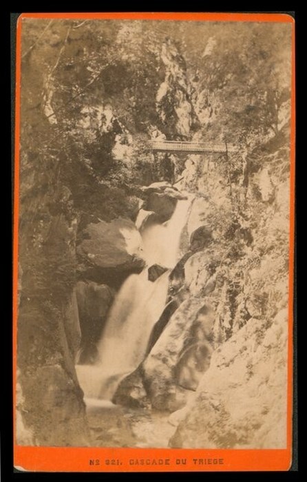 Veduta della cascata di Triège e di un ponte che la attraversa.