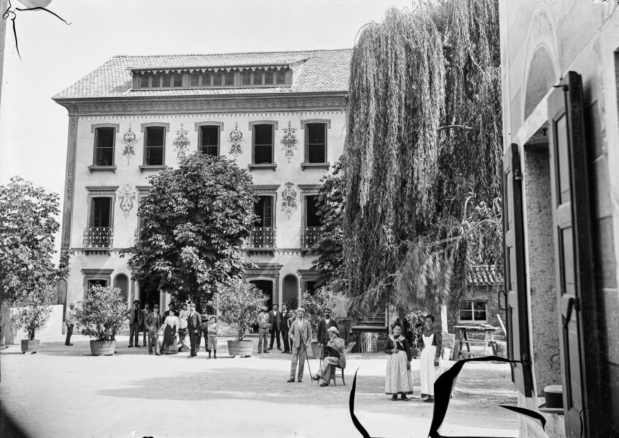 Nobili e domestiche ritratte nel giardino di una villa.