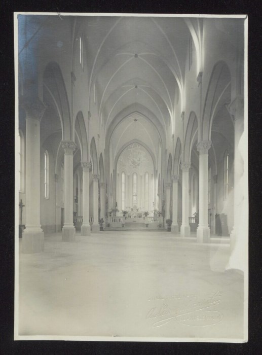 Interno della nuova Chiesa di Santa Croce a Muris, frazione di Ragogna, costruita nel 1933 e consacrata il 14 giugno 1934 dall'arcivescovo mons. Giuseppe Nogara. Sul verso della fotografia è presente il timbro ad inchiostro "FOT. D.VIRGILIO, SAN DANIELE DEL FRIULI", due date a timbro "20 NOV. 1934" e le annotazioni a penna "Nuova Chiesa di Muris Ragogna" e "E.F. XIII" (ovvero tredicesimo dell'Era Fascista) accanto ad una delle due date a timbro.