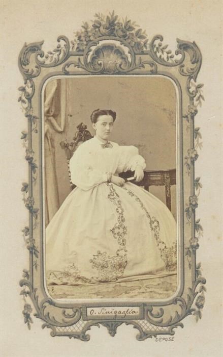 Ritratto, in studio, della giovane O. Sinigaglia con ampio vestito chiaro e ventaglio chiuso nelle mani