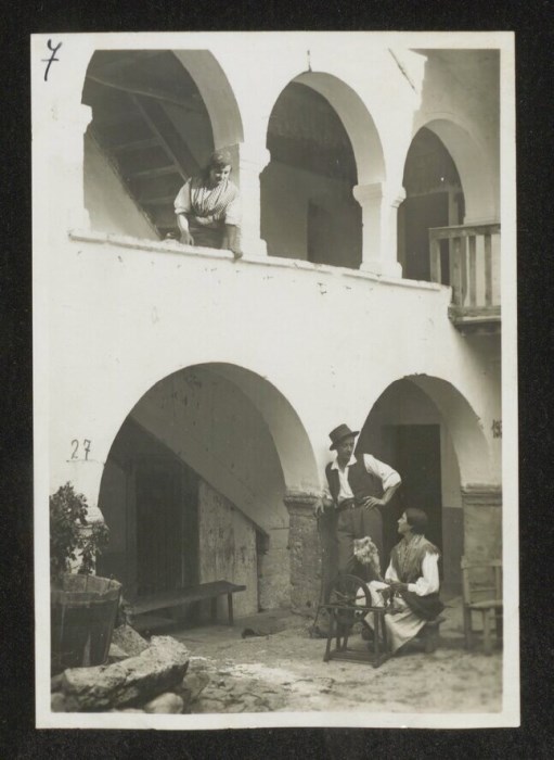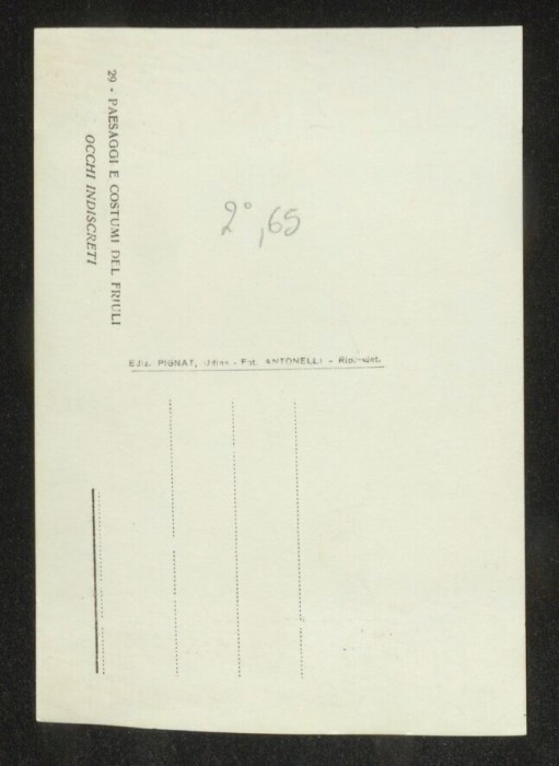 Lo scatto di Umberto Antonelli, farmacista e fotografo attivo in Carnia tra 1909 e 1949, è parte della serie di cartoline pubblicate dal fotografo editore Carlo Pignat con il titolo "Paesaggi e Costumi del Friuli" nella seconda metà degli anni Trenta del Novecento, raffiguranti tutte una Carnia e un Friuli arcadici. L'immagine ritrae i modelli Italo Luciano Bearzi e Aurelia Frucco in abiti tradizionali carnici, mentre lei lavora all'arcolaio nel cortile della casa e lui appoggiato al pilastro del porticato la osserva. Un'altra donna affacciata dal piano superiore li guarda.