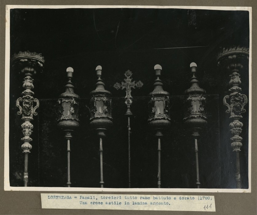 Riproduzione fotografica di oggetti processionali in rame battuto e dorato (fanali e torcieri) ed una croce astile in lamina d'argento conservati presso la Chiesa di San Silvestro a Lorenzaga a Motta di Livenza.