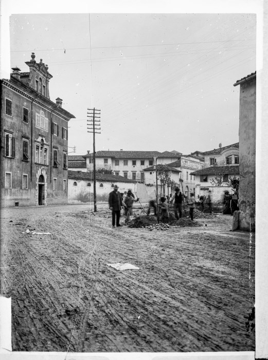 Un gruppo di operai al lavoro mentre scavano una buca sul ciglio di una strada fangosa fra gli edifici storici nel centro della città di Udine; la veduta ci mostra via Treppo e a sinistra è visibile Palazzo dalla Porta.