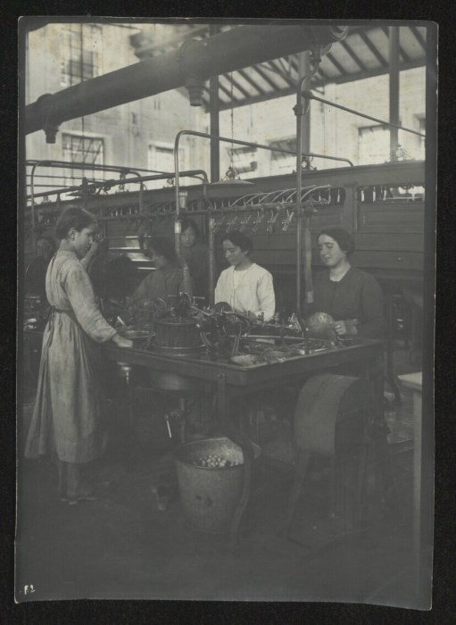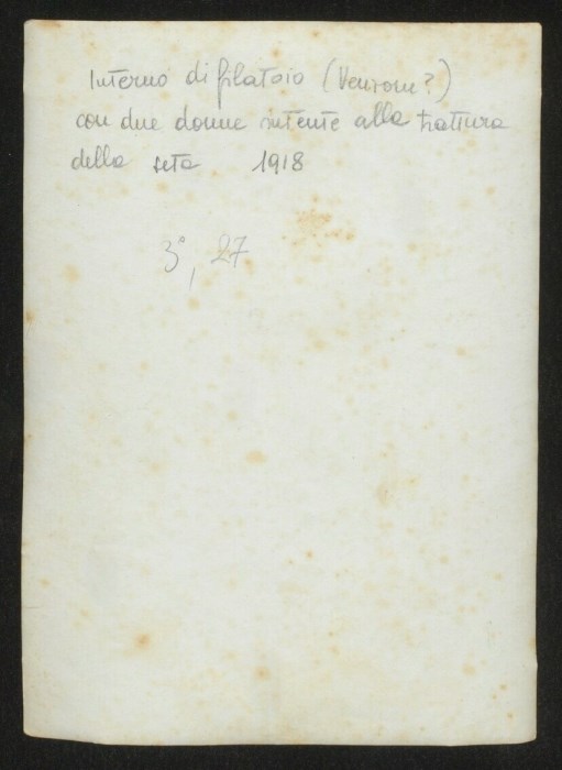 Interno di filatoio (Venzone?) con due donne intente alla trattura della seta, 1918