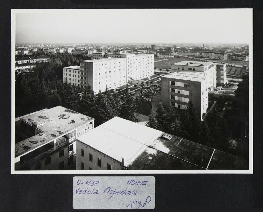 Udine: veduta aerea della città e dell'hinterland. In primo piano, l'Azienda Ospedaliero-Universitaria "Santa Maria della Misericordia", realizzata su progetto dell'architetto Eugenio Mariotti (iniziata a costruire nel 1924).