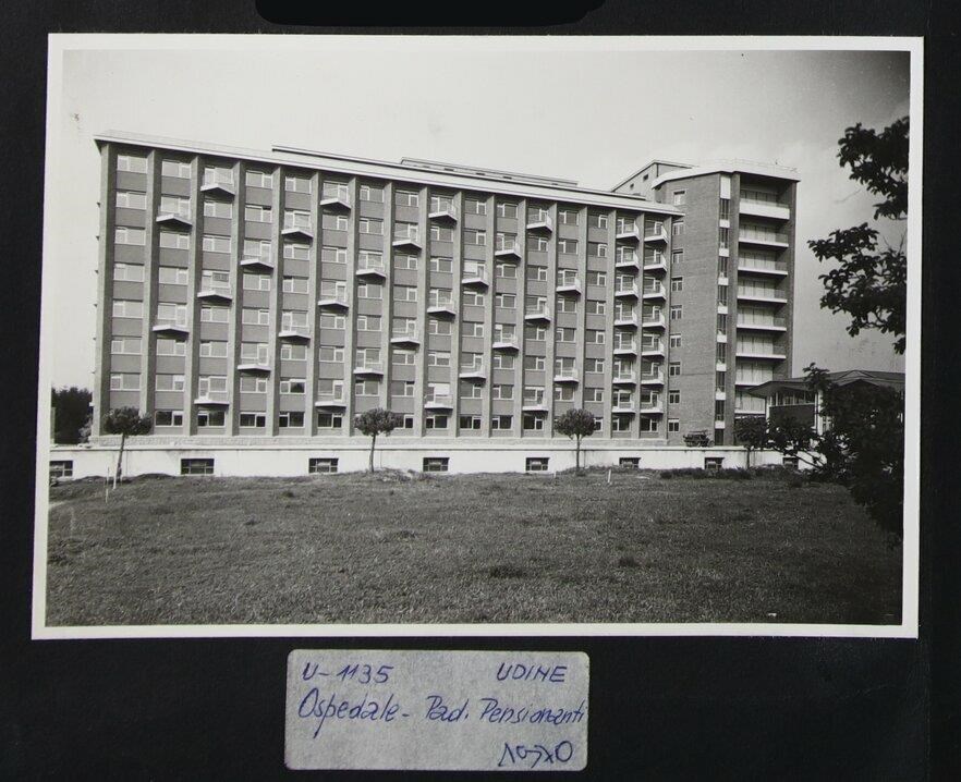 Udine: padiglione Pensionanti (inizi degli anni Sessanta) appartenente, assieme agli altri sette padiglioni, all'Azienda Ospedaliero-Universitaria "Santa Maria della Misericordia" (iniziata a costruire nel 1924). L'edificio, così come gli altri dell'ospedale tra il 1924 e il 1963, venne realizzato su progetto dell'architetto Eugenio Mariutti.