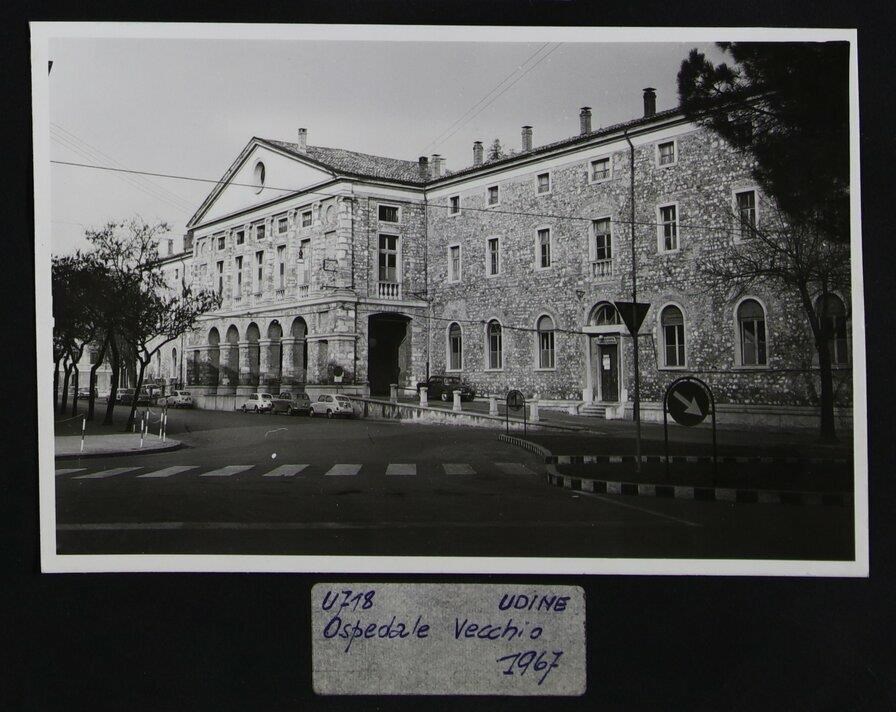 Udine, Largo Ospedale Vecchio 1,2: veduta dell'ingresso dell'Ospedale Vecchio progettato dall'architetto Pietro Bianchi (1782) con una pianta a croce greca e quattro cortili, anche se buona parte del complesso è stato realizzato grazie agli interventi successivi dell'architetto Giuseppe Segusini. Si tratta dell'attuale sede del Tribunale.