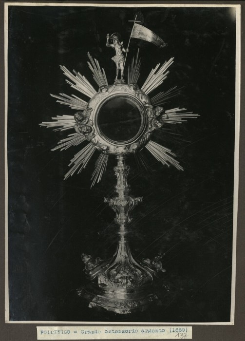 Riproduzione fotografica di un grande ostensorio in argento databile al 1660, secondo don Francesco Pascotto, e conservato presso la Chiesa di San Giacomo Apostolo a Polcenigo.