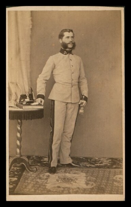 Ritratto a figura intera in studio del barone Oswald Br. Schneeburg in divisa militare.