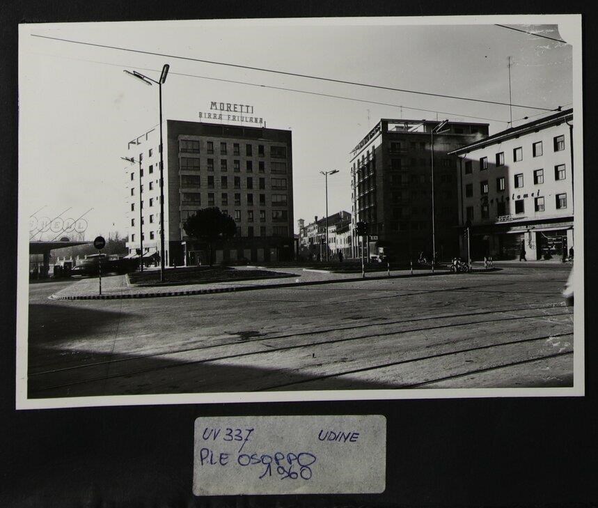 Udine: veduta di piazzale Osoppo, quinta cerchia muraria. In primo piano, le rotaie del tram. A sinistra, un'aiuola e lo stabilimento dell'azienda petrolifera Shell. Sempre a sinistra, l'edificio ex sede della CRUP (Cassa di Risparmio di Udine e Pordenone, al piano terra) dell'architetto Ermes Midena (1940-1950). L'edificio è sviluppato su otto piani nel rispetto della tipologia a blocco. Sopra di esso, è collocata l'insegna "Moretti Birra Friulana". Verso il centro, parte di via Gemona. A destra, il caffè Bartolomei e il condominio realizzato su progetto dell'architetto Mariano Pittana all'angolo tra via Gemona e via Francesco di Toppo (impresa F.lli Agosto, 1954).