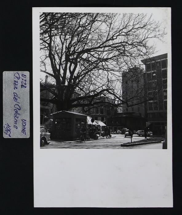 Udine: veduta di piazza del Pollame (o degli Uccelli), dove si faceva commercio di animali vivi al riparo del platano secolare. Sullo sfondo a destra, via del Gelso, zona oggetto di interventi urbanistici verso la metà del secolo scorso.