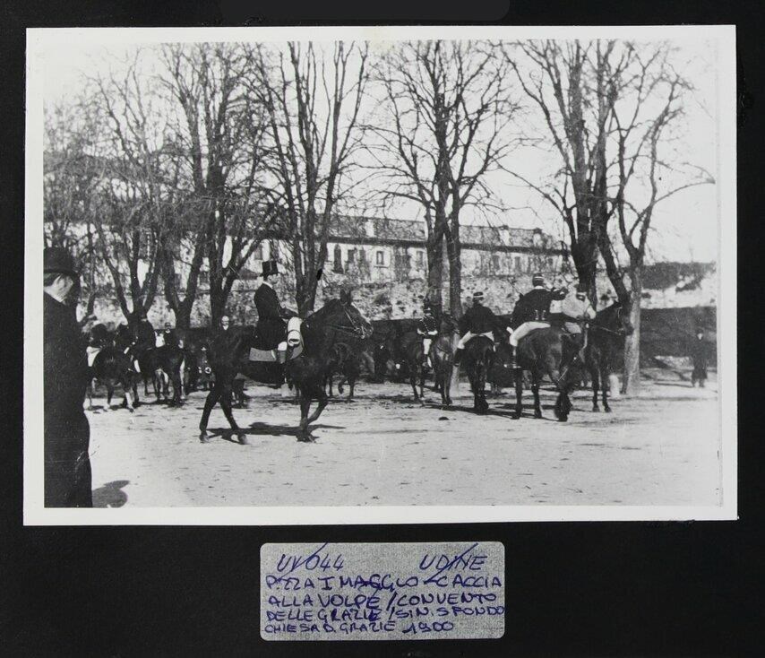 Udine: veduta di piazza I Maggio. Diversi uomini a cavallo, tra cui alcuni in divisa. Sullo sfondo, dietro agli alberi, il Santuario della Beata Vergine delle Grazie.