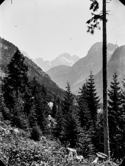 Paesaggio di montagna con alberi e vegetazione in primo piano nelle Alpi Giulie