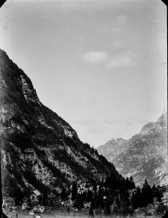 Paesaggio montano con costa di montagna in primo piano, in basso a sinistra tra rocce e abeti un piccolo rifugio alpino.