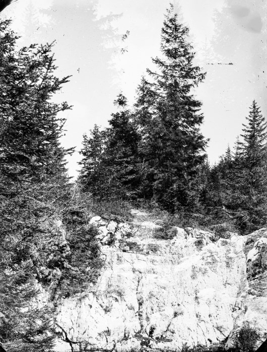 Paesaggio di montagna con rocce e abeti in primo piano.