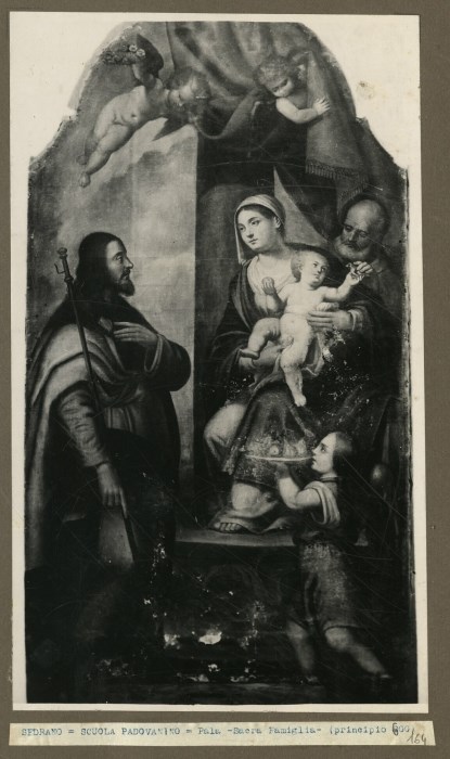 Riproduzione fotografica con la pala de "La sacra famiglia" conservata presso la Chiesa di San Giacomo Apostolo a Sedrano. Nell'opera è visibile a destra la Sacra famiglia, un paggetto che offre un vassoio imbandito, a sinistra probabilmente un fedele provvisto di bastone.