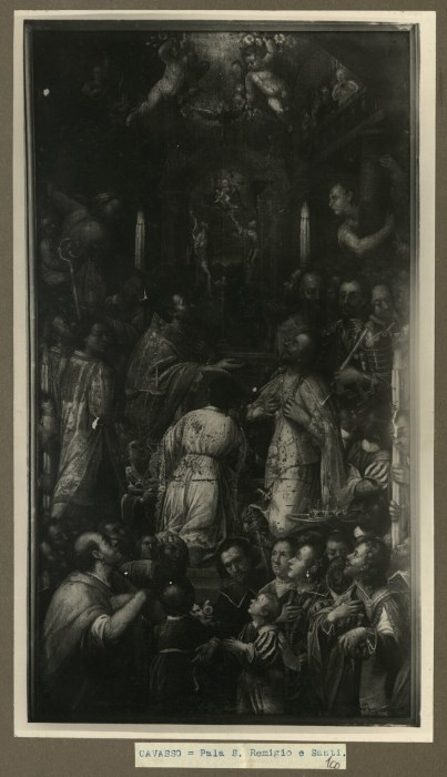 Riproduzione fotografica della Pala con San Remigio ed altri Santi mentre sono in adorazione, a loro volta, di una pala dipinta con la Madonna con Bambino, conservata presso la Chiesa di San Remigio a Cavasso Nuovo.