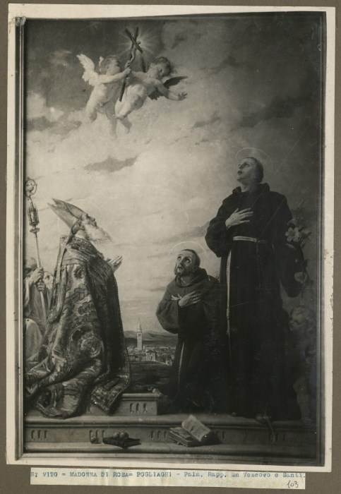 Riproduzione fotografica della pala raffigurante "Un vescovo e due Santi" a opera di Ludovico Pogliaghi e conservata presso il Santuario della Madonna di Rosa a San Vito al Tagliamento.