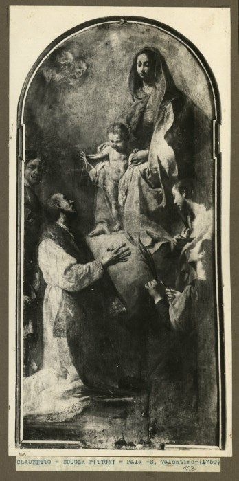 Riproduzione fotografica della pala con la "Madonna con Bambino e San Valentino" conservata presso uno degli altari nella Chiesa di San Giacomo a Clauzetto.
