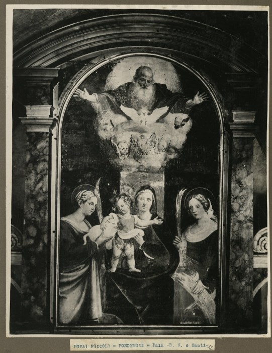 Riproduzione fotografica della Pala raffigurante "Madonna col Bambino tra le Sante Agnese e Caterina con l’Eterno Padre in gloria" a opera del Pordenone e conservata presso la Chiesa di Sant'Agnese Vergine e Martire, situata alle spalle della moderna parrocchiale con il medesimo nome a Rorai Piccolo di Porcia.