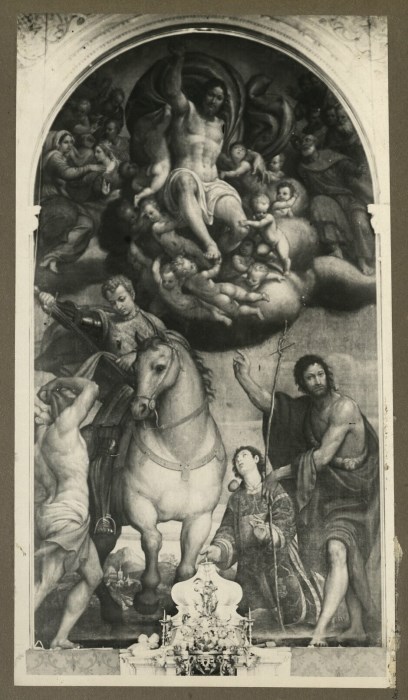 Riproduzione fotografica della pala dell'altare maggiore nella Chiesa di San Martino Vescovo a San Martino al Tagliamento: raffigurante "Cristo in gloria e i Ss. Martino, Stefano e Giovanni Battista" a opera di Pomponio Amalteo. Nell'immagine in basso è visibile una porzione del tabernacolo.