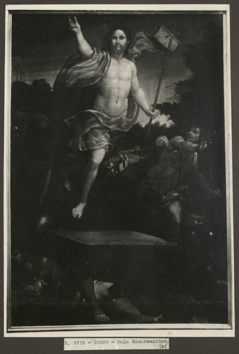 Riproduzione fotografica della pala raffigurante la "Resurrezione di Cristo" a opera dell'Amalteo nel 1546 collocata sopra la porta della sacrestia nel Duomo di San Vito al Tagliamento.